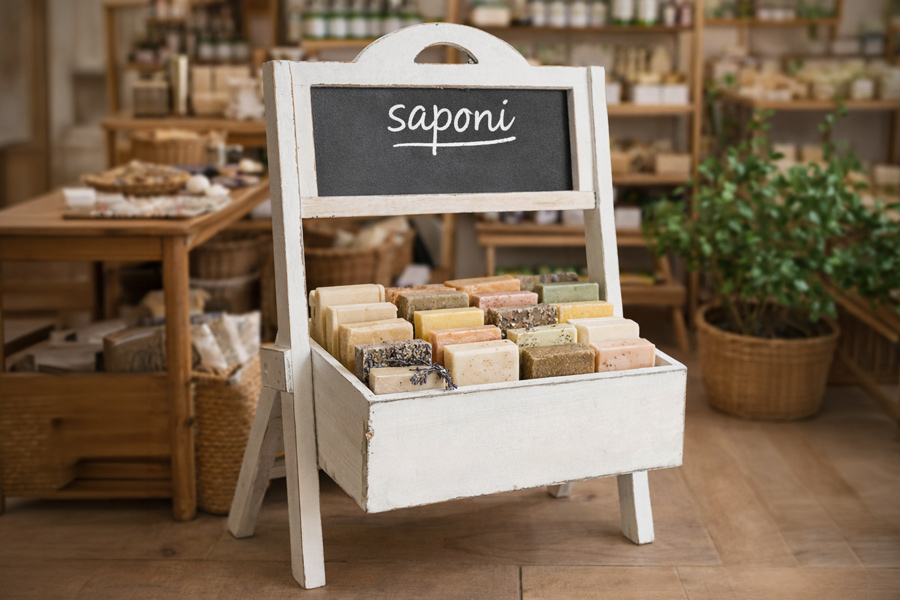 Display in legno pensati per un’esposizione ordinata e naturale.