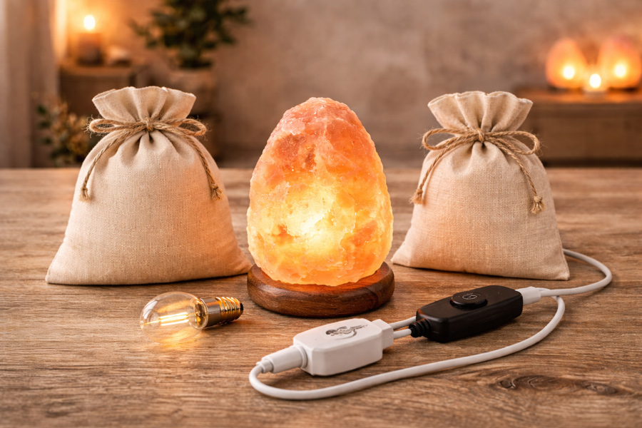 Tutti gli accessori necessari per completare e valorizzare le lampade di sale: basi, cavi, lampadine e soluzioni per la confezione.