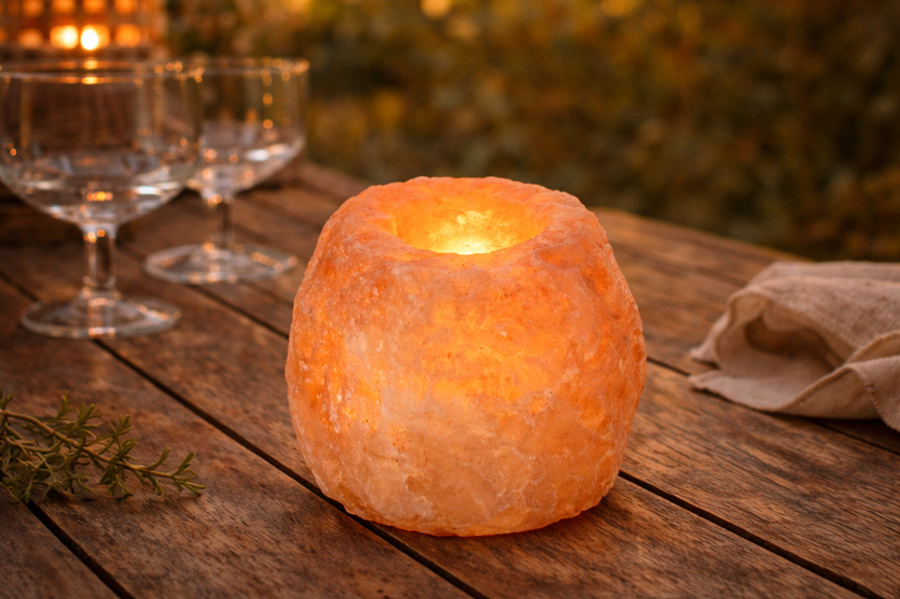 Portalumini realizzati in sale rosa dell’Himalaya, in versione grezza o levigata. Creano un’atmosfera calda e accogliente con un semplice lumino.