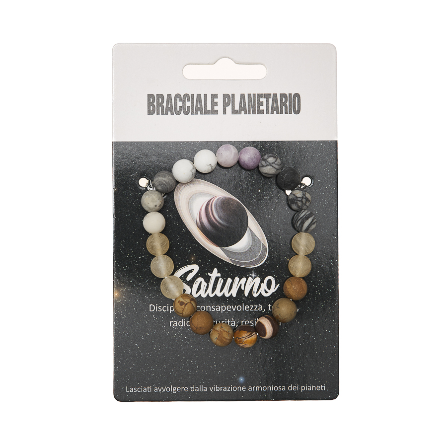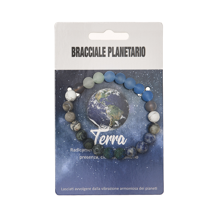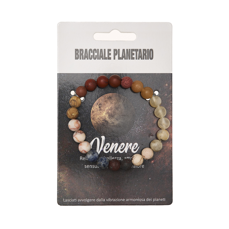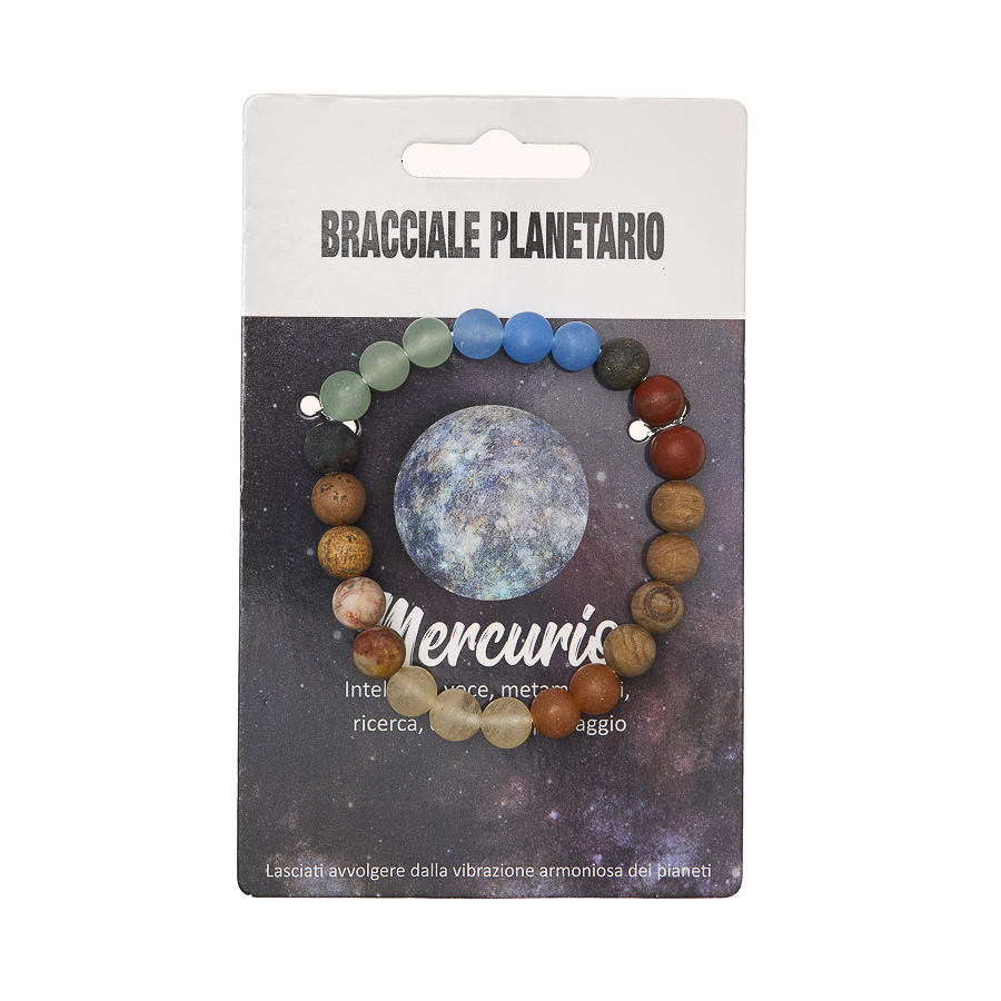 I Bracciali Planetari sono disponibili anche in display in legno da 24 pezzi assortiti, pensato per una presentazione ordinata e scenografica nel punto vendita. La collezione è dedicata agli 8 pianeti del sistema solare, ognuno rappresentato attraverso pietre selezionate in armonia con il suo significato simbolico. Ogni bracciale diventa un talismano personale, capace di richiamare qualità interiori e archetipiche legate al pianeta di riferimento.