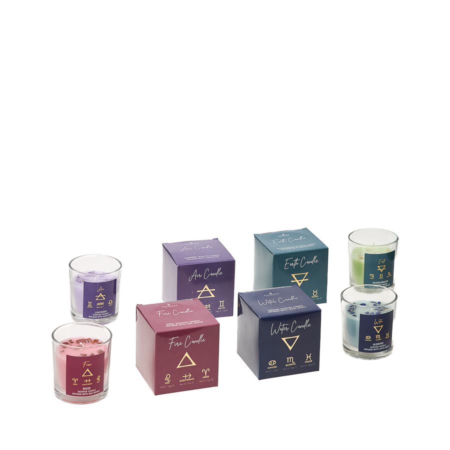 Ogni elemento – Acqua, Fuoco, Aria e Terra – è collegato ai relativi segni zodiacali, riportati sulla confezione, trasformando la candela in un dono simbolico e personalizzato. L’accensione diventa così un gesto che richiama la propria energia elementale, accompagnato da fragranze evocative e dalla presenza del cristallo. Ogni candela è impreziosita da un’elegante confezione regalo tematica, pronta per l’esposizione e la vendita.