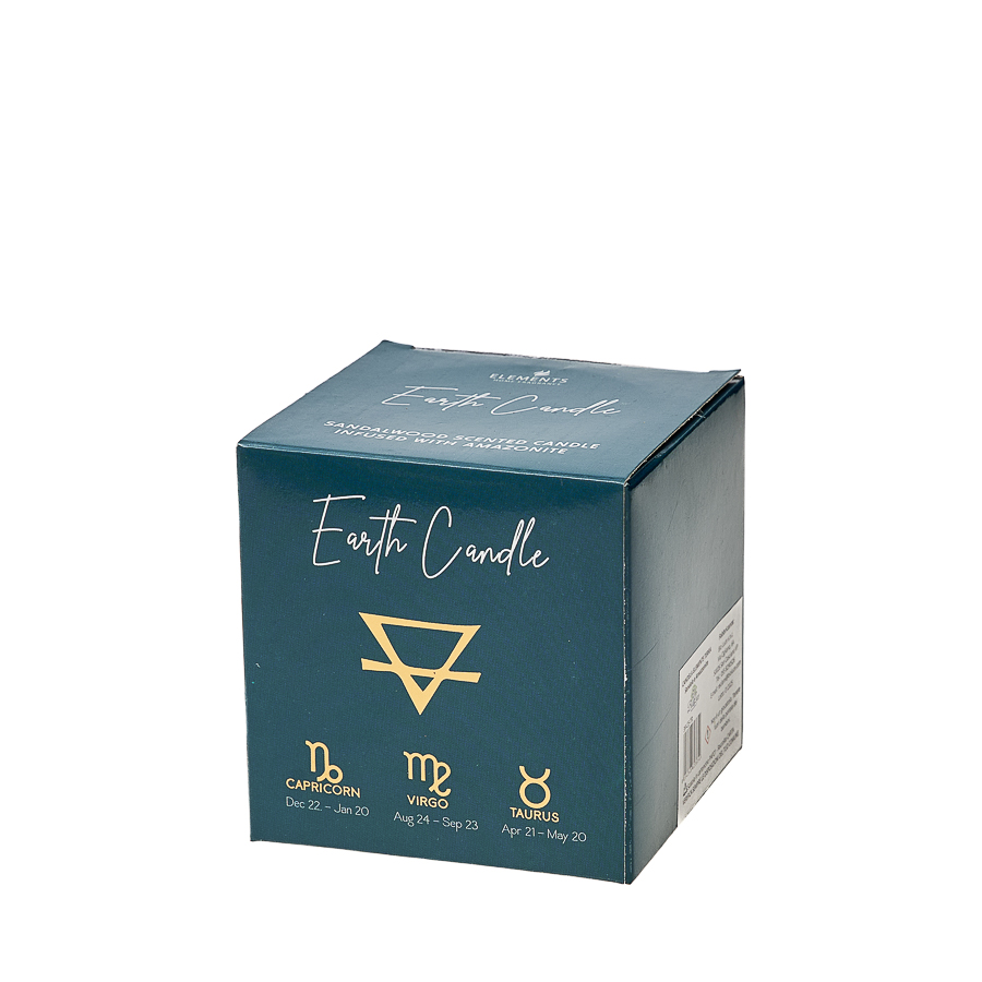 Candela Elements Terra Fragranza Sandalo con Amazzonite: Evoca stabilità, radicamento e concretezza, collegata ai segni zodiacali di terra.