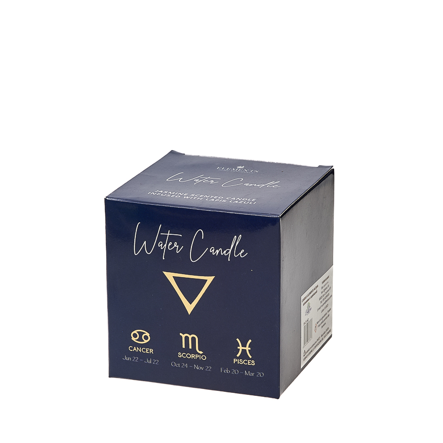 Candela Elements Acqua Fragranza Gelsomino con Lapislazzuli: Ispirata alla fluidità e alla profondità emotiva, con segni zodiacali d’acqua riportati sulla confezione.