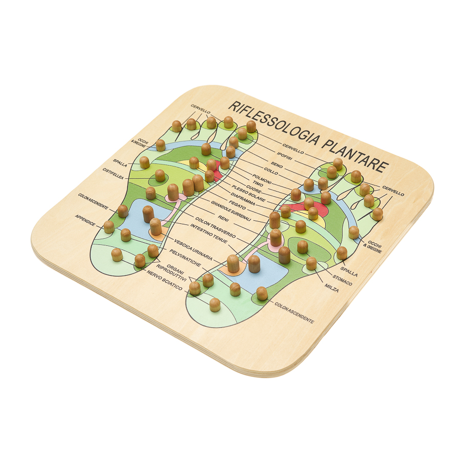 Questa tavola massaggiante in legno è progettata per la pratica della riflessologia plantare, disciplina che considera il piede come una mappa riflessa dell’intero organismo. La superficie presenta il disegno dei piedi con protuberanze posizionate in corrispondenza dei principali punti riflessi, pensate per stimolare in modo naturale e progressivo le diverse aree energetiche. Utilizzata camminando o sostando sopra la tavola, favorisce una stimolazione profonda e consapevole della pianta del piede, accompagnando la percezione di rilassamento, vitalità e riequilibrio generale. È adatta sia a un uso quotidiano domestico sia come supporto nelle pratiche di massaggio olistico.
